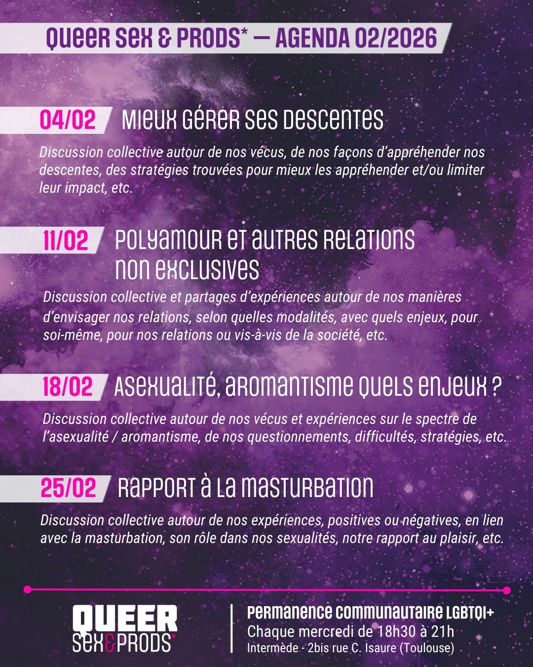 >> Discussion collective autour de nos vécus et de nos expériences sur le spectre de l’asexualité et/ou de l’aromantisme, partages de nos questionnements passés ou présents, des difficultés parfois rencontrées et/ou des stratégies trouvées pour les dépasser, etc.